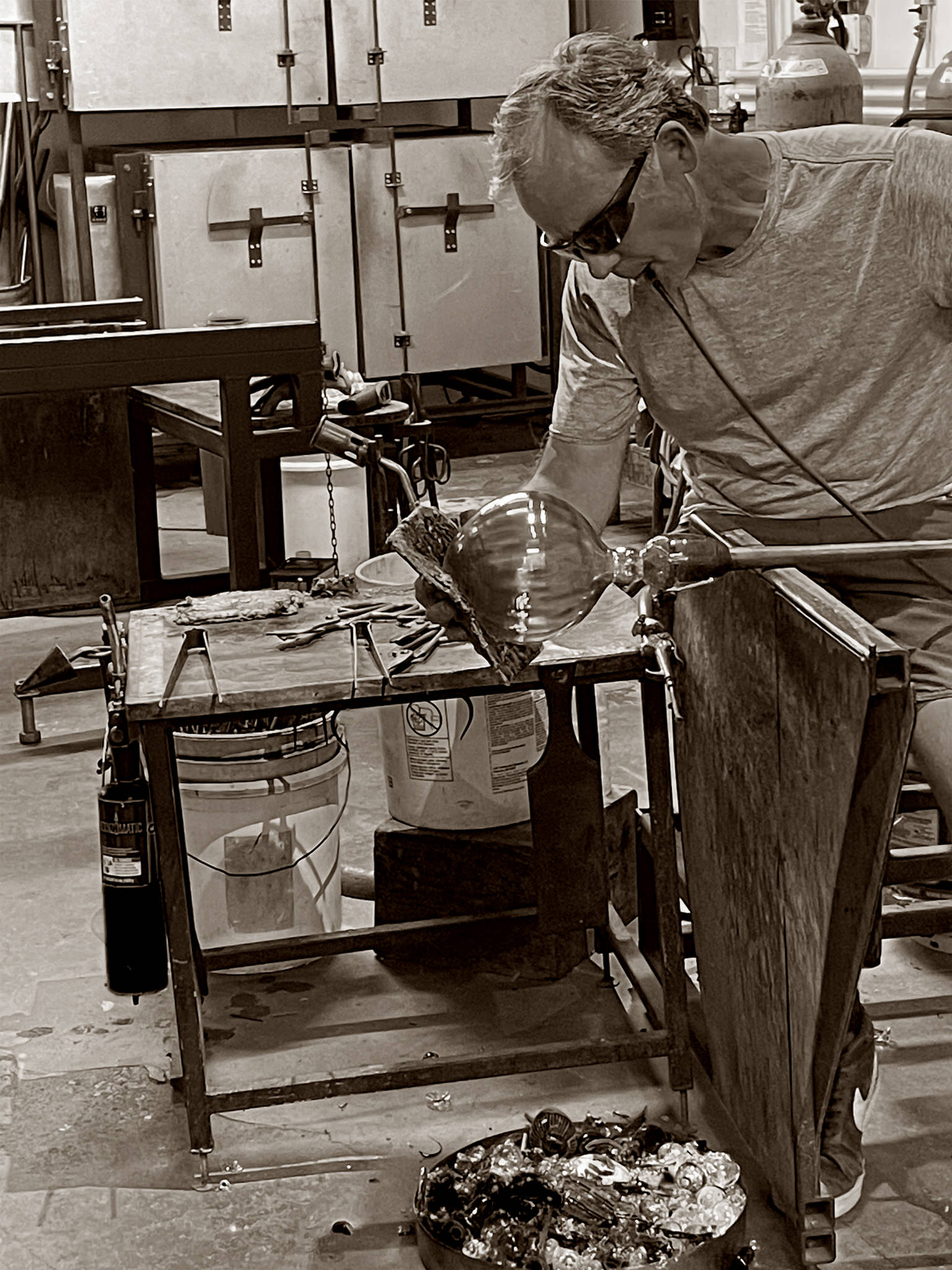 Glass working techniques have evolved for thousands of years. I’ve benefited from those early traditions, borrowing many old world techniques to help me realize my own vision. Using these techniques, glassblowing for me has become a process of taking a super hot liquid and freezing it to room temperature in a controlled--and sometimes precarious--balancing act of heat, gravity, timing and human intervention.
