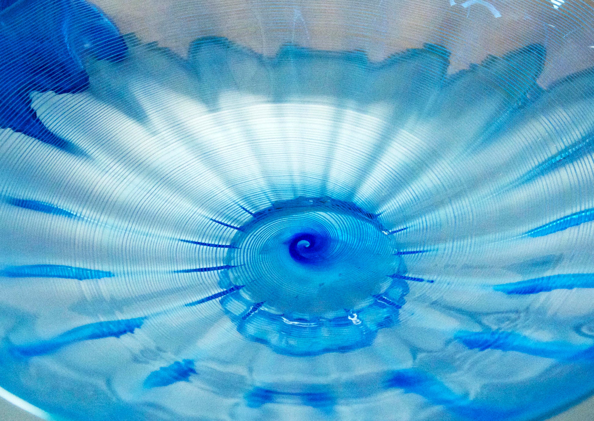 These designs are inspired by a Venetian Glass Blowing technique using thin rods or canes of colored glass that are fused together, wound around a bubble of glass and twisted and blown to create tiny, super fine lines or threads of color in the vessel. These pieces demonstrate some of the delicate, complex patterns that can be achieved with the unique, almost magical properties of cane-worked blown glass.