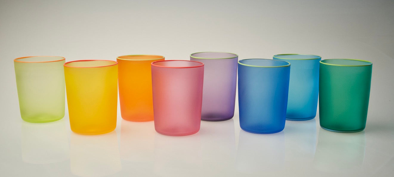 These glass tumblers are blown with colored glasses and contrasting lip colors of either orange or green. Each tumbler is then finished with an etched, sandblasted surface creating a beach-glass effect that is soft to the touch.