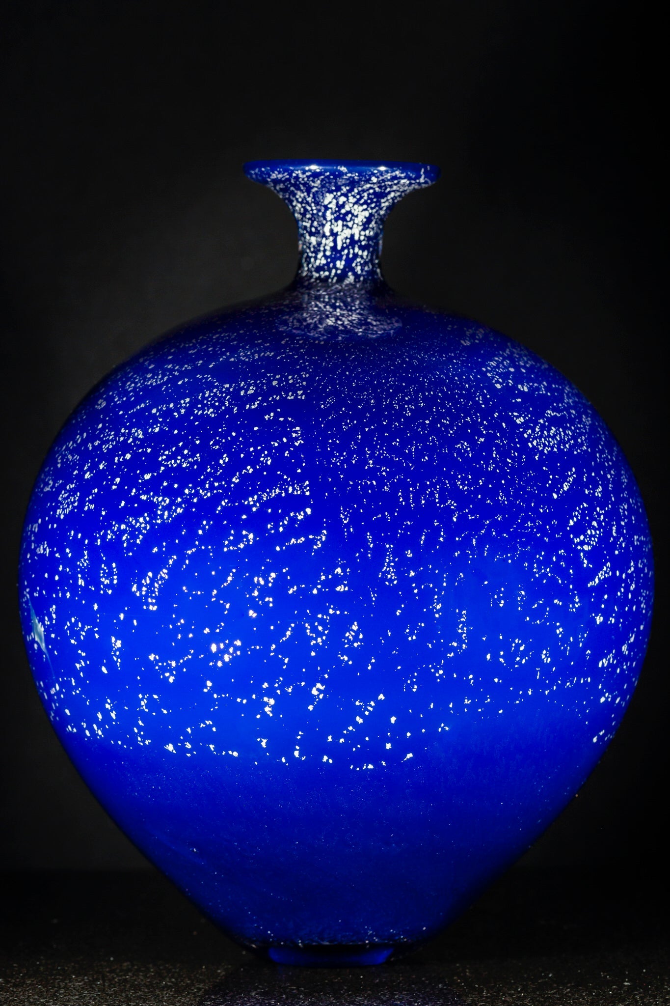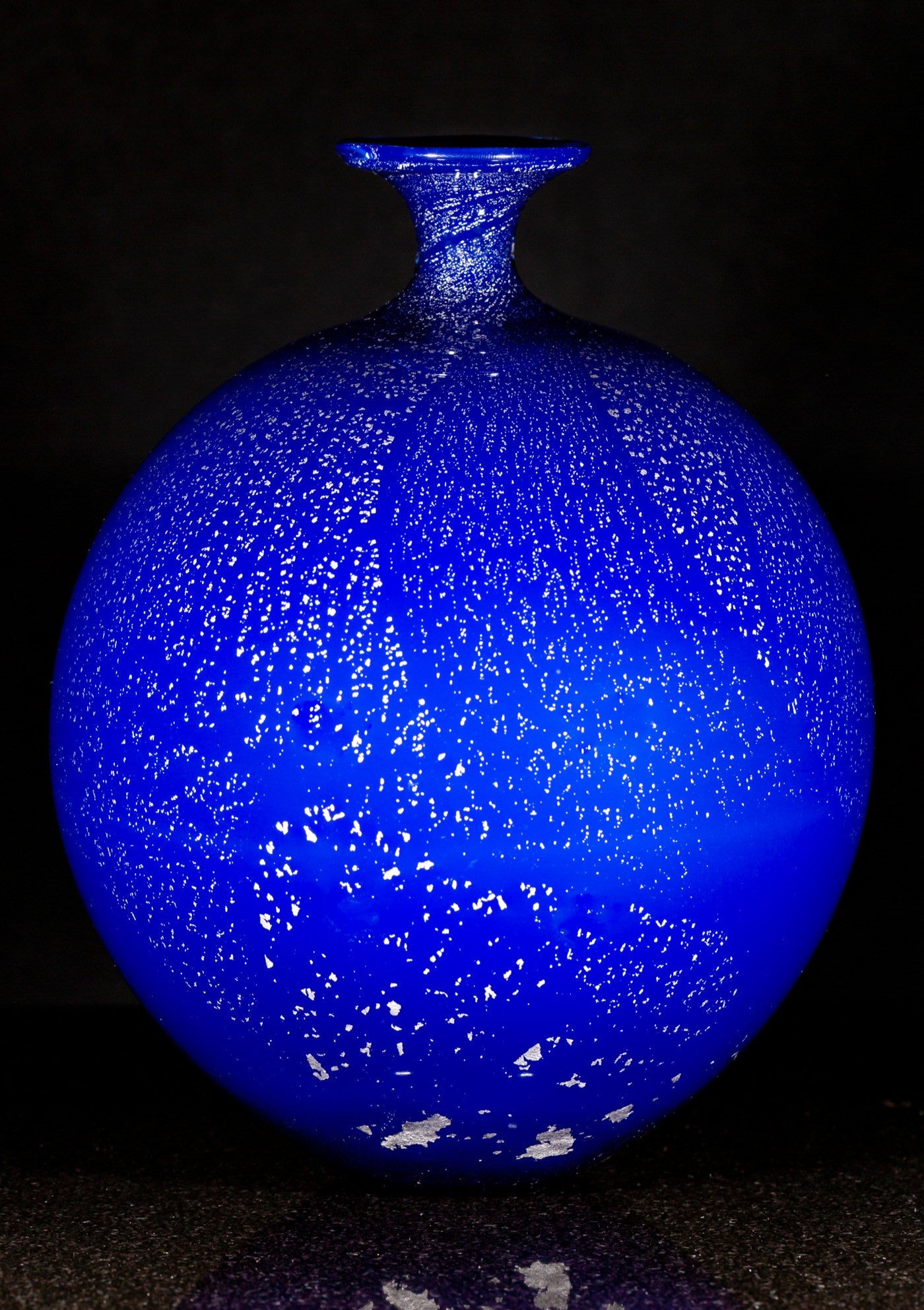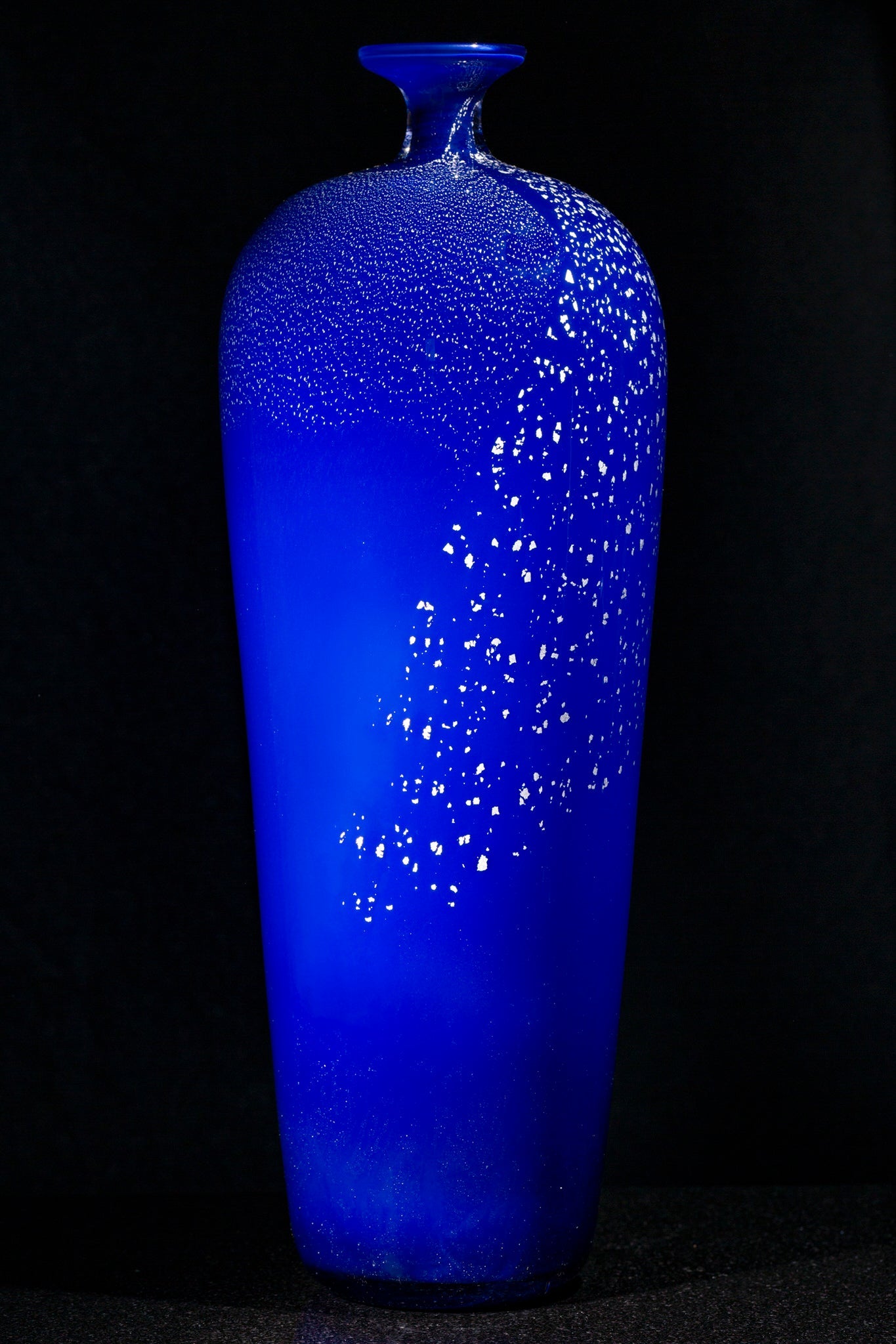 These pieces are made of clear and midnight blue glasses with Silverleaf inclusions. Gathering a final layer of clear glass over the dark blue with silver core allows the piece to be blown larger, stretching the silver leaf into an organic surface pattern resembling the night sky. Finished with a clear glass lip wrap.