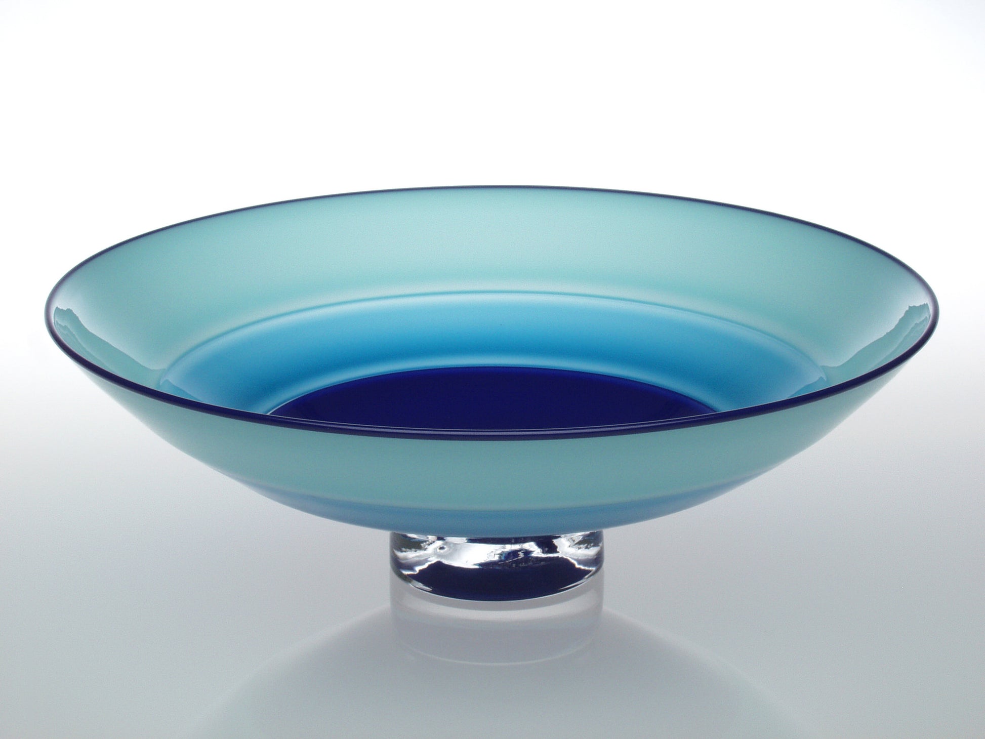 Incalmo is the technique of fusing separate bubbles of hot glass together to form one larger vessel. In these pieces I join three different opaque colored glasses to create the largest of my shallow bowls; they are a true statement piece. Each is made with a crystal clear glass pedestal foot and finished with a signature colored glass lip wrap. Choose from two different bright opaque color combinations.